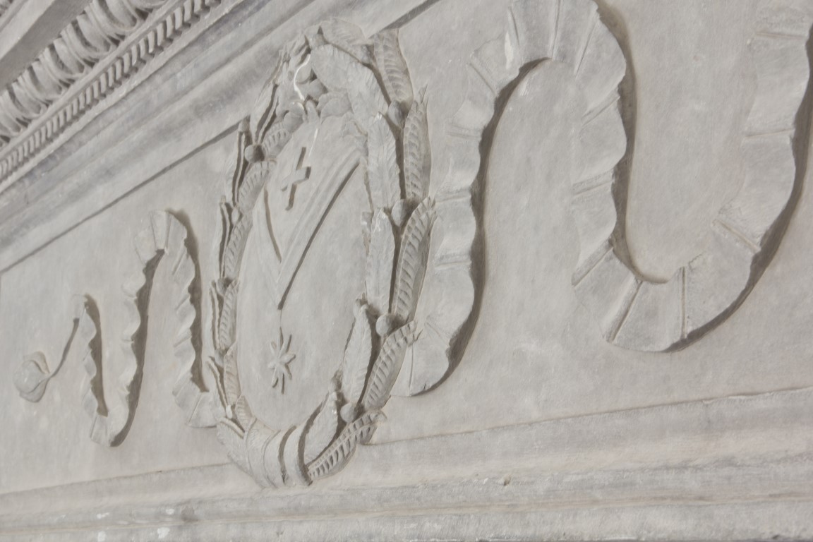 - Important architrave carved in relief with emblem in the center and side panels depicting sea creatures.